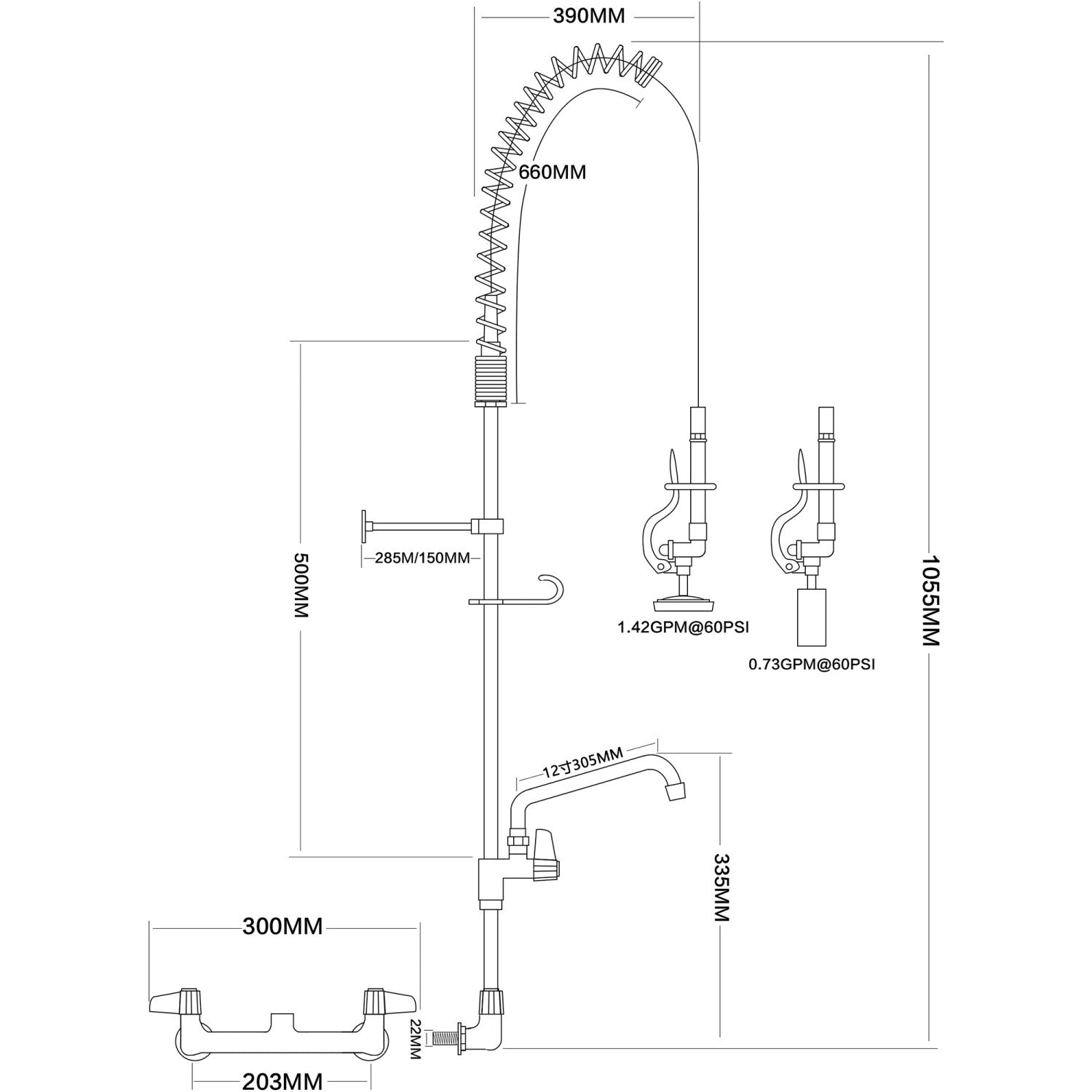 8&Quot; Wall Mount Commercial Pre Rinse Faucet With Flexible Hose &Amp; Spray Valve &Amp; 12&Quot; Swing Nozzle Chrome Plated Brass | Eq2802 A12