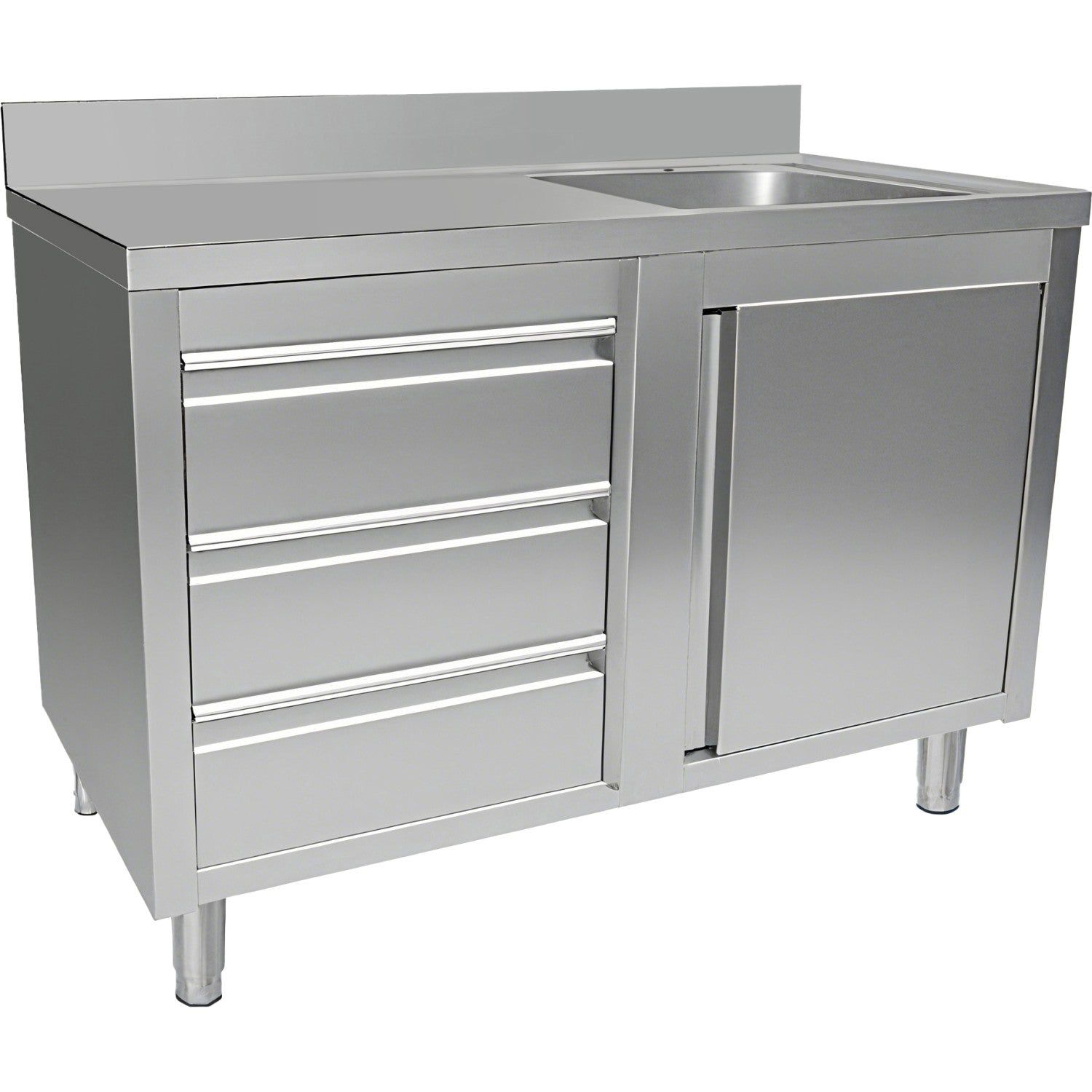 Commercial Sink With Cupboard And 3 Drawers Stainless Steel 1 Bowl Right Splashback 1200x600x950mm | Vsc126 Rbs3 Ld