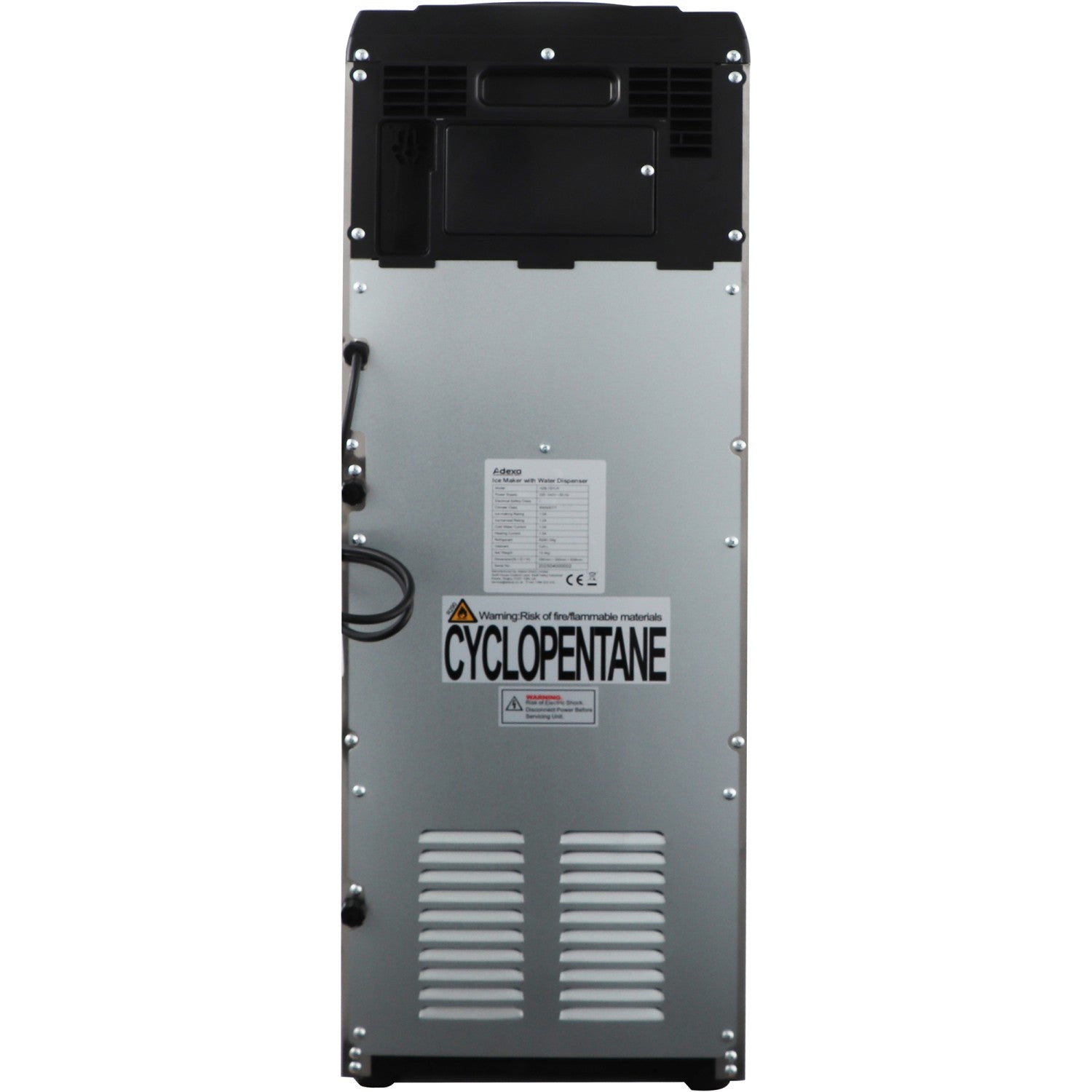 The Adexa HZB-15YLR is a multifunctional ice maker and water dispenser designed for commercial and home use. With a generous ice-making capacity of up to 15kg per day, it produces 9 bullet-shaped ice cubes per cycle and includes separate hot and cold water dispensing functions.
