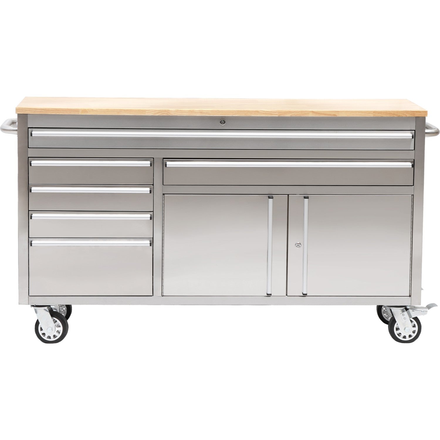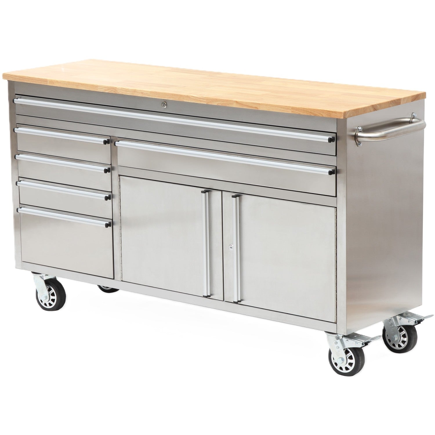 Heavy Duty Steel Rolling Tool Chest With Wooden Worktop 6 Drawers 1 Double Door Side Cabinet 1674x489x907mm Stainless Steel | 602038 Asilver