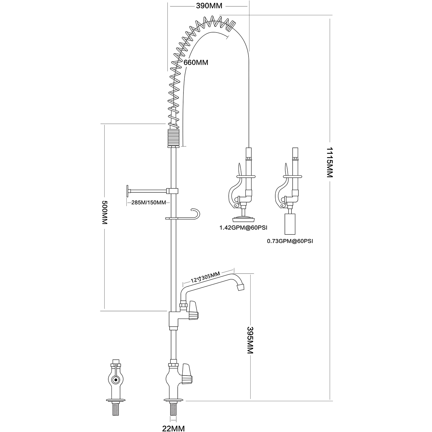Pre Rinse Spray Unit With Swing Faucet Deck Mount Single Inlet Height 1000mm Stainless Steel | Eq2803 A12