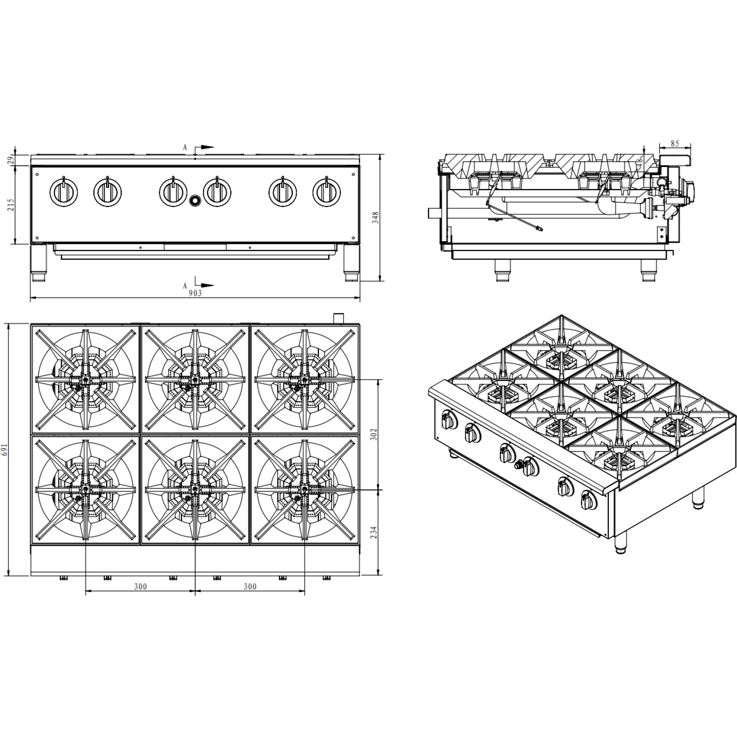 Professional Gas Hotplate Cooker 6 Burners 42k W Countertop | Ehp6 S